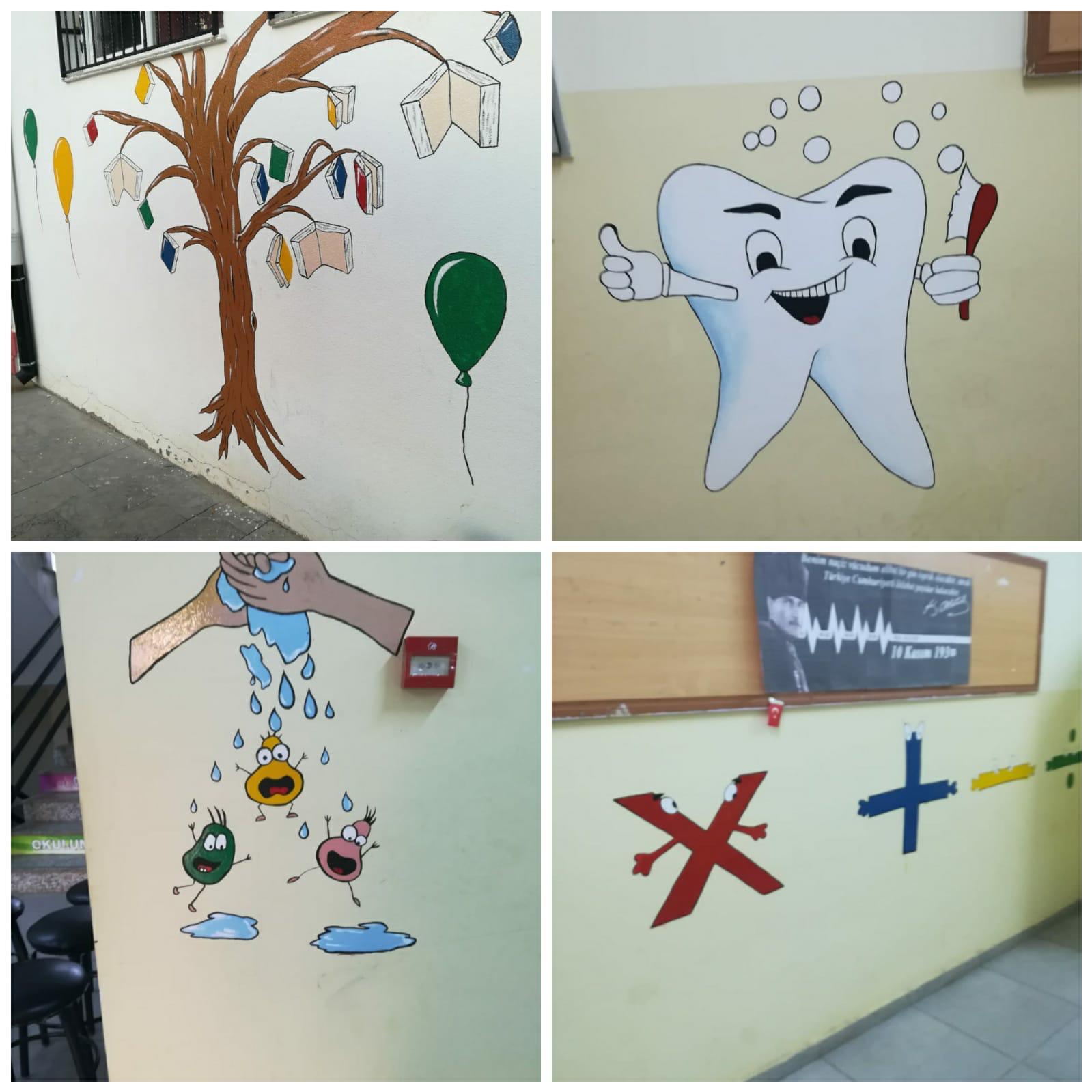 Kahramanmaraş Sütçü İmam Üniversitesi (KSÜ) Güzel Sanatlar Fakültesi (GSF) Resim Bölümü öğrencileri, Gaziantep'in Nurdağı ilçesinde Gedikli Osman Kaplan İlkokulu ile Gedikli Ortaokulu dış cephe ve koridorlarını birbirinden güzel resimlerle renklendirdi.