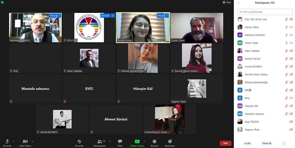 Kahramanmaraş Sütçü İmam Üniversitesi Güzel Sanatlar Fakültesi Dekanı Prof. Dr. Mehmet ÖZKARCI, Öğretim Elemanları ve Müzik Bölümü öğrencilerinin katılımıyla, 2020-2021 Eğitim-Öğretim yılı Bahar yarıyılının ilk toplantısı, 3 Mart 2021 Çarşamba günü saat 12:00’de ZOOM üzerinden gerçekleştirildi. Dekan ÖZKARCI, öğrencilere sürecin nasıl ilerlediğini, yapılan derslerde sıkıntı yaşayıp yaşamadıklarını sordu. Öğrenciler yapılan derslerde hiçbir sıkıntı yaşamadıklarını ancak hocalarını ve üniversiteyi özlediklerini dile getirdiler. Öğrenciler bir araya gelmekten çok mutlu oldukları ifade ettiler. Dekan ÖZKARCI, öğrencilerimizle online üzerinden sohbet programlarının devam edeceğini belirterek, programa katılan hocalara ve öğrencilere teşekkür etti.