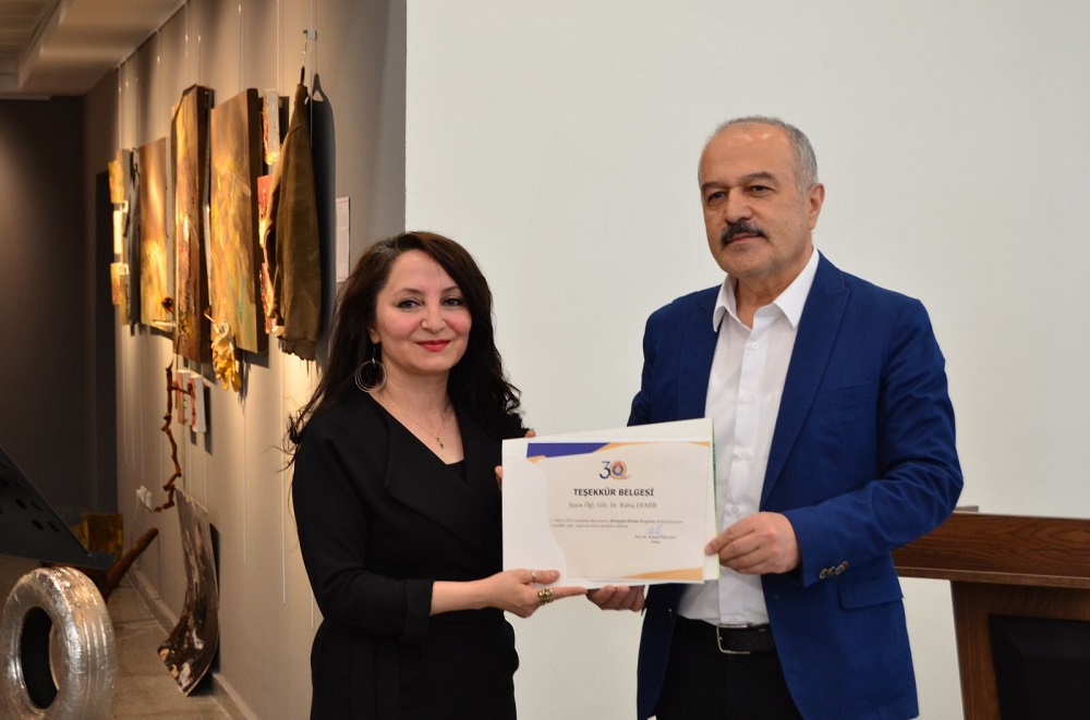 Üniversitemizin 30. Yılı etkinlikleri kapsamında düzenlenen serginin açılışında konuşan Güzel Sanatlar Fakültesi Dekanı Sayın Prof. Dr. Mehmet ÖZKARCI, sergide emeği geçen hocamız Dr. Rabia Demir ve öğrencilerini tebrik etti.
